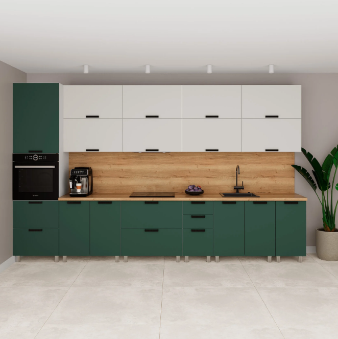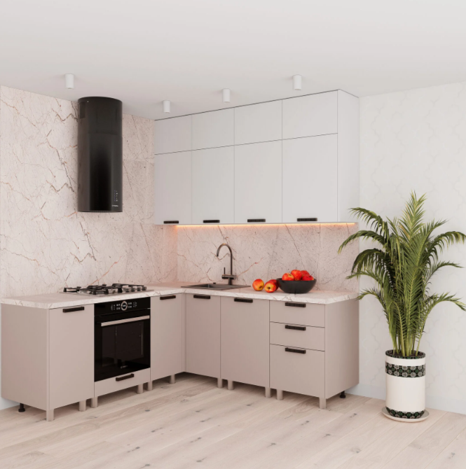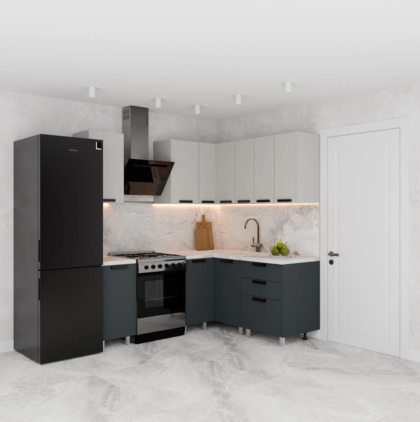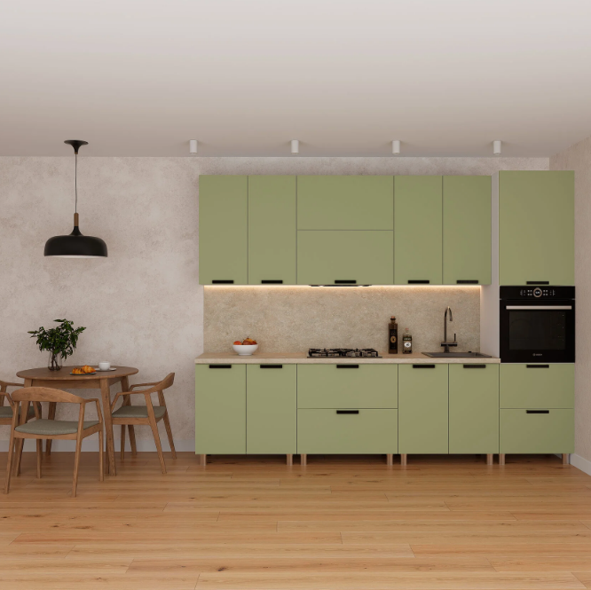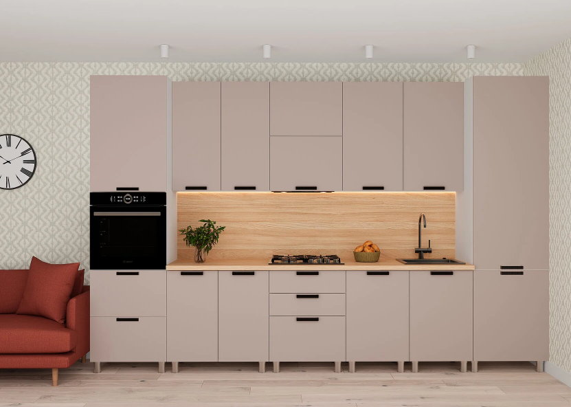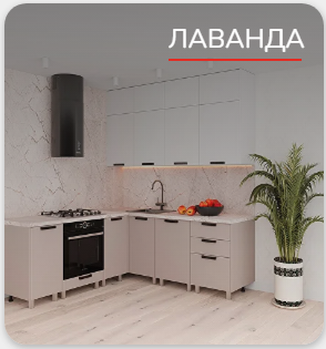 Гладкие фасады без фрезеровки создают ощущение чистоты и лёгкости, а спокойная геометрия делает «Лаванду» универсальной основой для современной кухни.