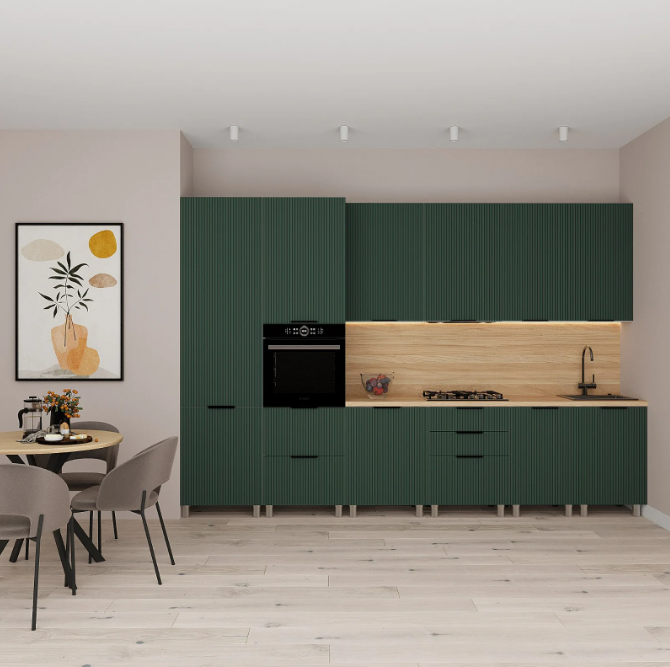 Простая геометрия фасадов визуально вытягивает пространство вверх: даже на маленькой кухне появляется ощущение высоты и воздуха.